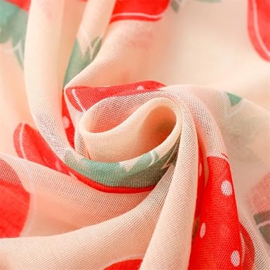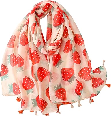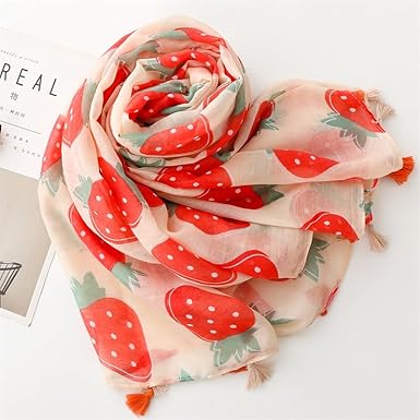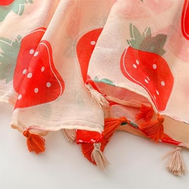 Cute Strawberry Print Tassel Scarf for Women – Lightweight Chiffon Shawl for Summer Sun Protection and Styling