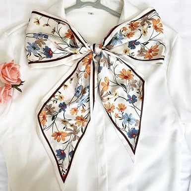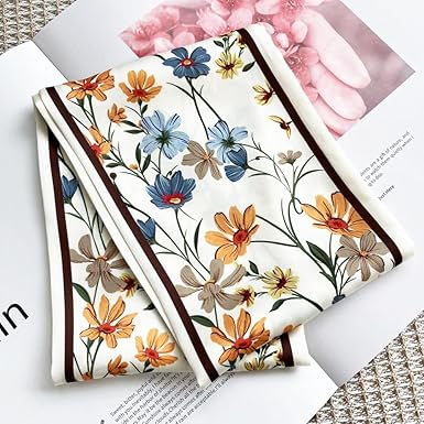 This elegant floral scarf features a soft white background scattered with colorful blooms in shades of orange, blue, and navy — a classic design that blends timeless charm with fresh sophistication. It’s the perfect accessory to complement everyday outfits, whether worn around the neck, tied on your handbag, or styled as a headband.